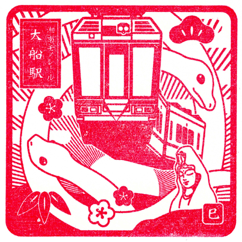 右:大船駅のスタンプも軌道が省略されたデザインで中央に大きく車両が描かれています。