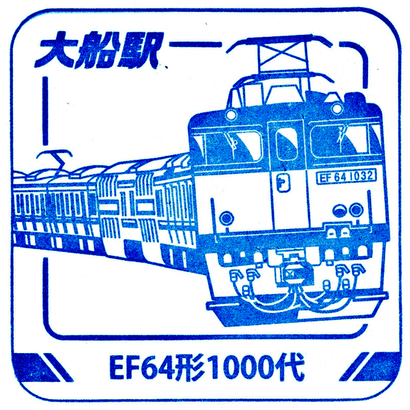 右:大船駅のスタンプはEF64形1000番台でした。新津からの配給列車をイメージしているようで、2階建てグリーン車を挟んだ電車をけん引している様子が描かれています。