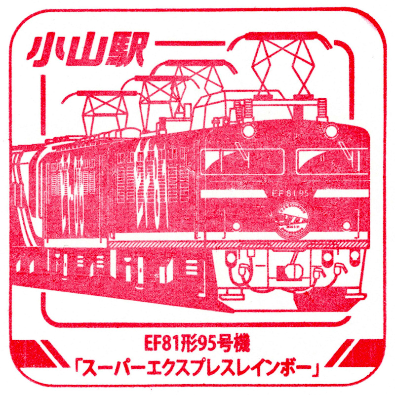 右:小山駅のスタンプはEF81形95号機でした。ジョイフルトレインである「スーパーエクスプレスレインボー」の牽引機として専用塗装を纏っています。