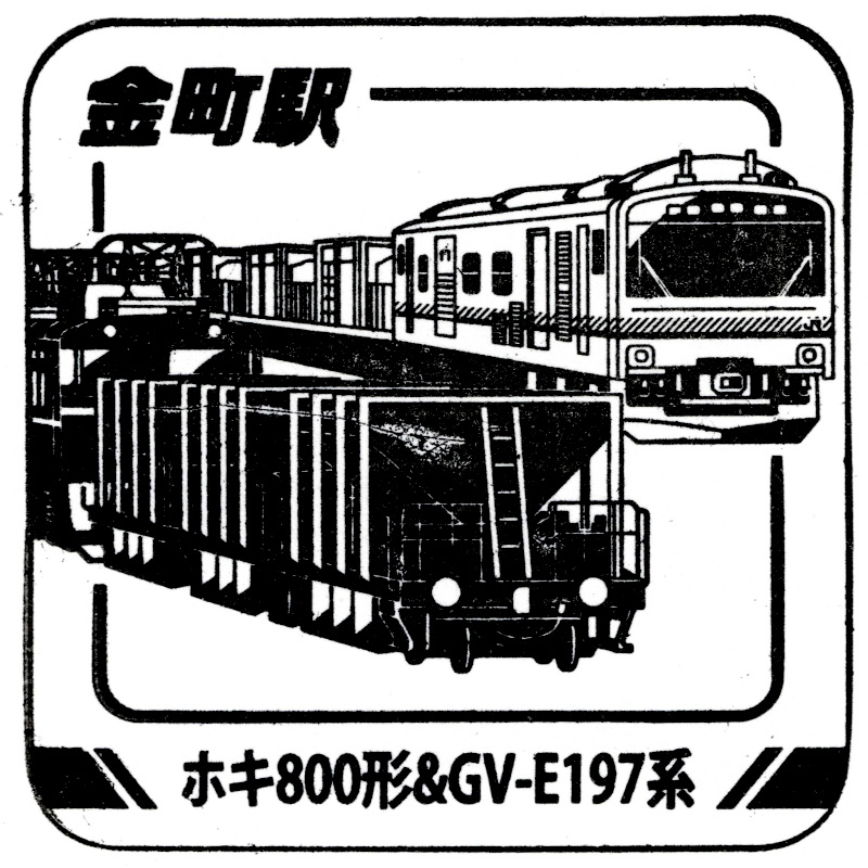 左:金町駅のスタンプはホキ800形とGV-E197系でした。機関車の複雑な運転操作を簡略化するために製造された牽引車と貨車の組み合わせです。鉄道ファンからの評判はすこぶる悪いです。