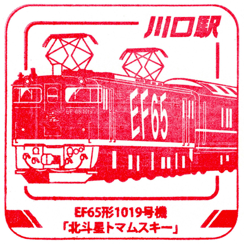 右:川口駅のスタンプはEF65形1019号機でした。一緒に描かれている「北斗星トマムスキー」は北斗星の一種のようで、発着地が横浜であったり札幌には向かわずトマムへ向かうなど北斗星とは異なる点も多いです。