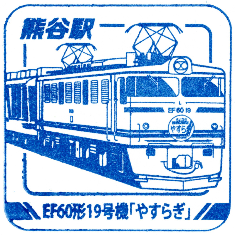 左:熊谷駅のスタンプはEF60形19号機とお座敷列車「やすらぎ」でした。機関車は客車に合わせた専用塗色です。客車については引退後にわたらせ渓谷鉄道へ譲渡されています。