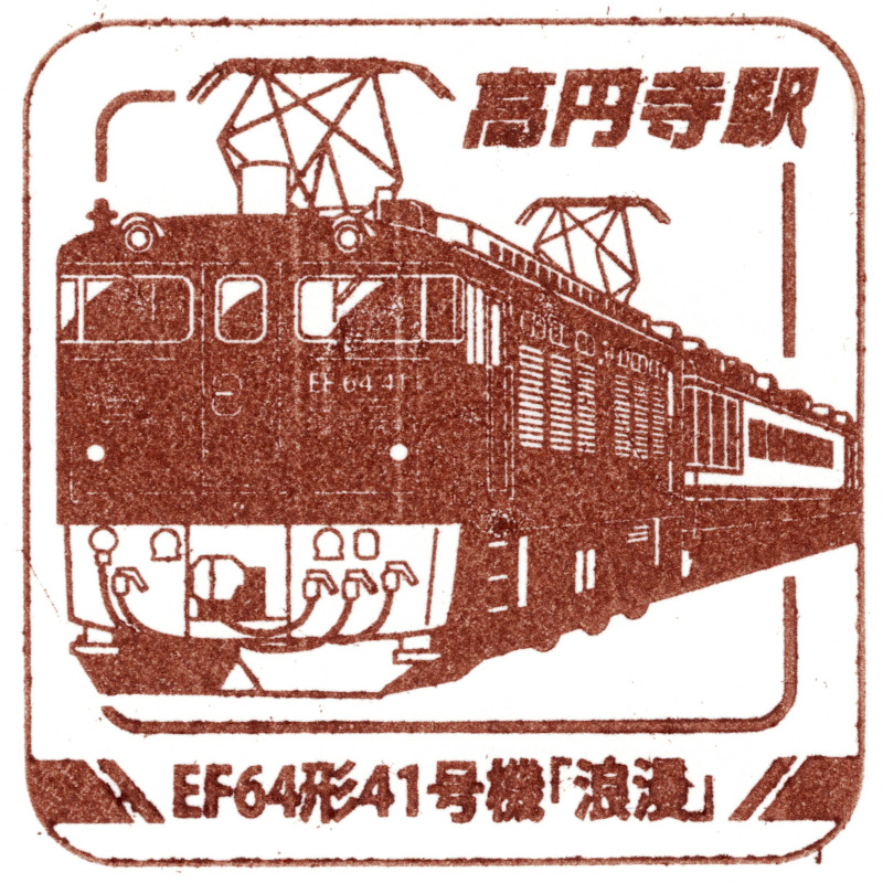 右:高円寺駅のスタンプはEF64形41号機とジョイフルトレイン「浪漫」でした。機関車は専属というわけではありませんが、ぶどう色に塗装されている個体でした。