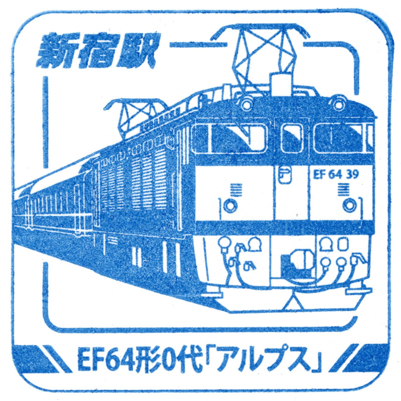 右:新宿駅のスタンプはEF64形0番台と夜行列車「アルプス」でした。アルプスと言えば臨時の夜行列車という印象だったのですが、かつては昼行便も設定されていたそうです。