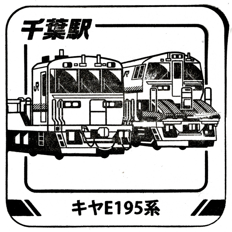 右:千葉駅のスタンプはキヤE195系でした。形式名は同一でも左の定尺レール輸送車と右のロングレール輸送車では外見や編成長が違います。