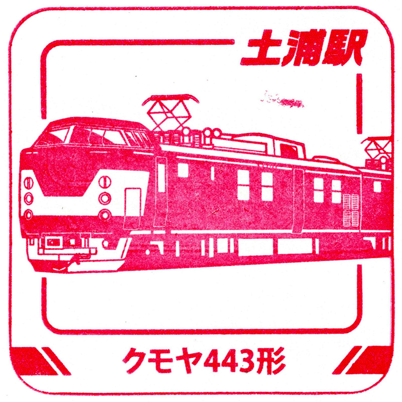 右:土浦駅のスタンプはクモヤ443形でした。電気検測用の交直流車両でした。後継のE491系登場に伴い引退しています。