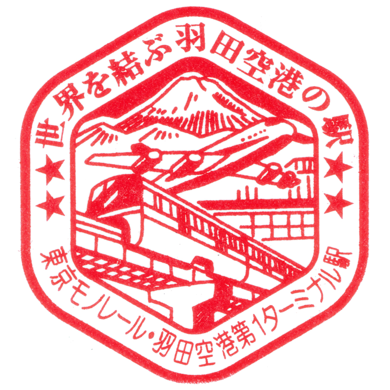 左:羽田空港第1ビル駅のスタンプはターミナルビルと車両が描かれています。第2ターミナルと比べるとやや古さを感じますが、それでも豪華な雰囲気は今も衰えていません。