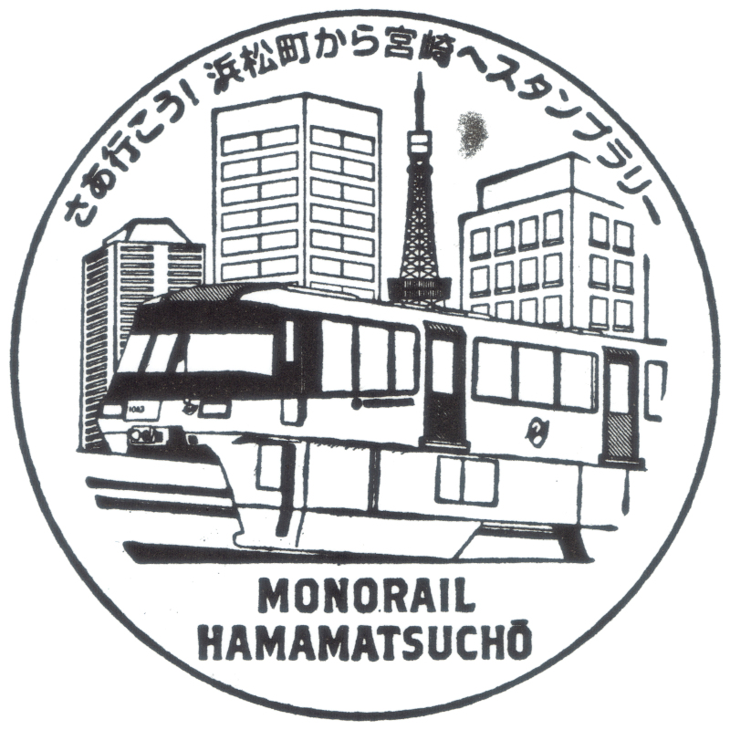 左:東京モノレール×ソラシドエア×JR九州×宮崎県合同企画のスタンプラリーで浜松町駅に設置されていたスタンプです。車両や沿線風景が細かく表現された良いデザインです。