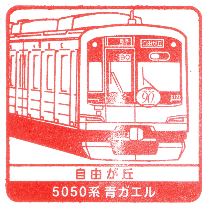 左:自由が丘駅のスタンプは5050系青ガエルラッピング編成でした。東横線90周年を記念したもので期間限定の予定でしたが、好評により現在まで継続されています。