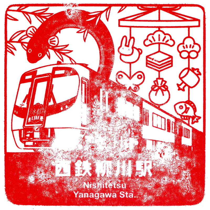 右:西鉄柳川駅の駅スタンプには3000形が描かれています。コンコースに常設なのであまり状態は良くありません。
