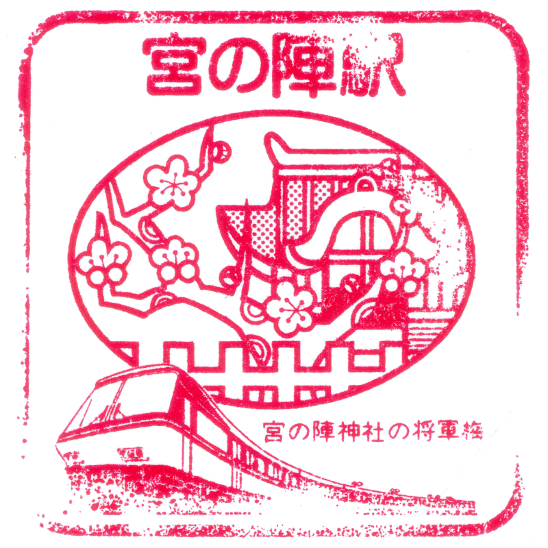 左:宮の陣駅には年代物の駅スタンプが残されています。描かれているのは特急型車両であった8000形です。