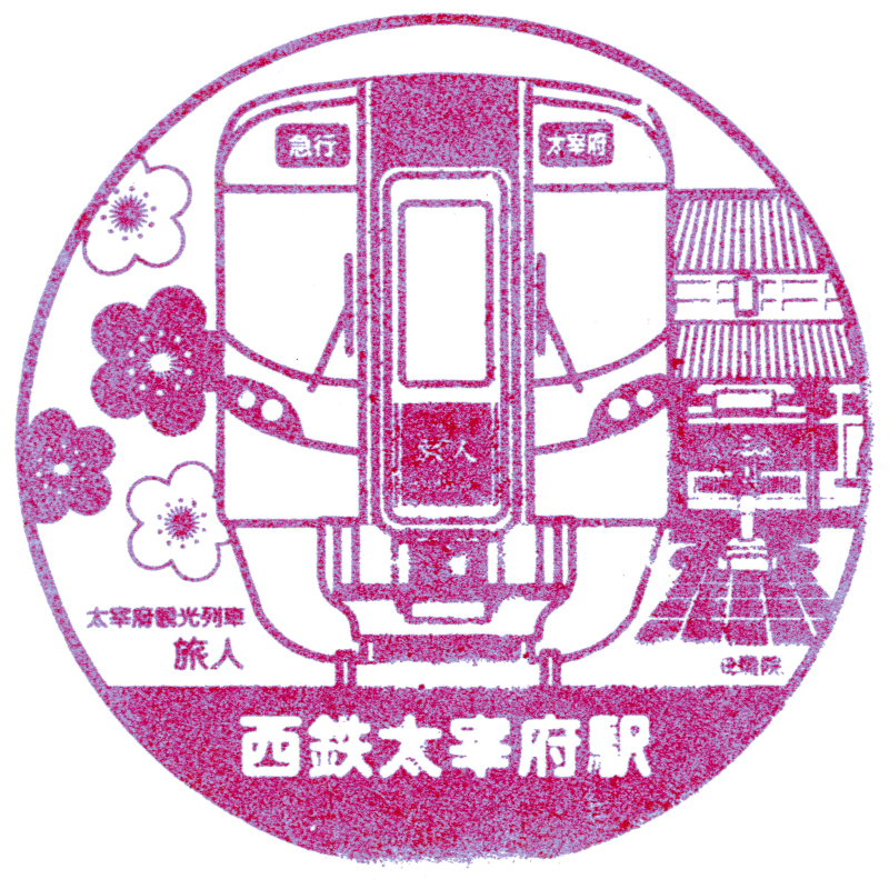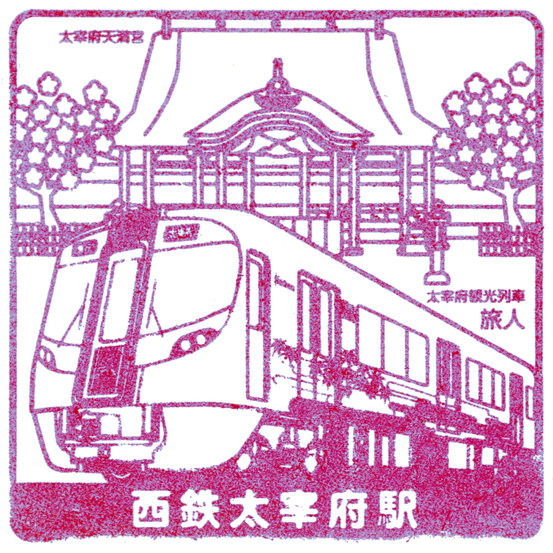 左:西鉄大宰府駅のもう一つの駅スタンプには大宰府観光列車の「旅人」が描かれています。