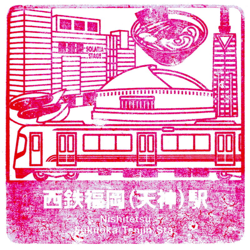 右:西鉄福岡(天神)駅の駅スタンプには3000形が描かれています。西鉄のスタンプは全体的に状態が悪いですね。