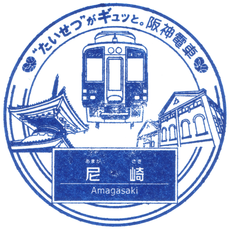 右:尼崎駅のスタンプには5500系武庫川線仕様車が描かれています。4両編成の中間車に先頭車化改造を実施して2両編成となってワンマン運転を実施しています。