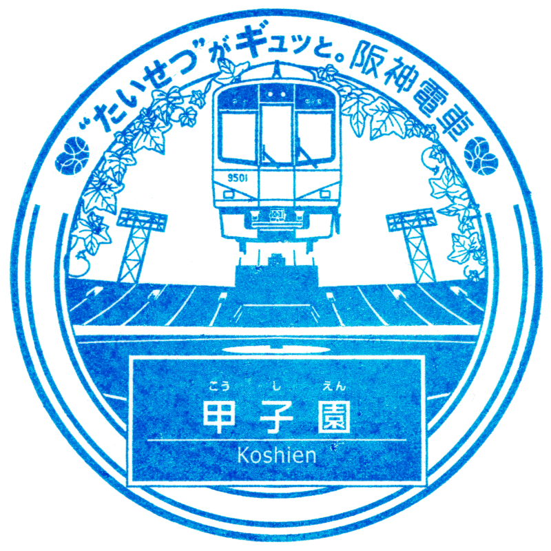 左:甲子園駅のスタンプには9300系が描かれています。背景には駅名にもなっている甲子園球場が描かれています。