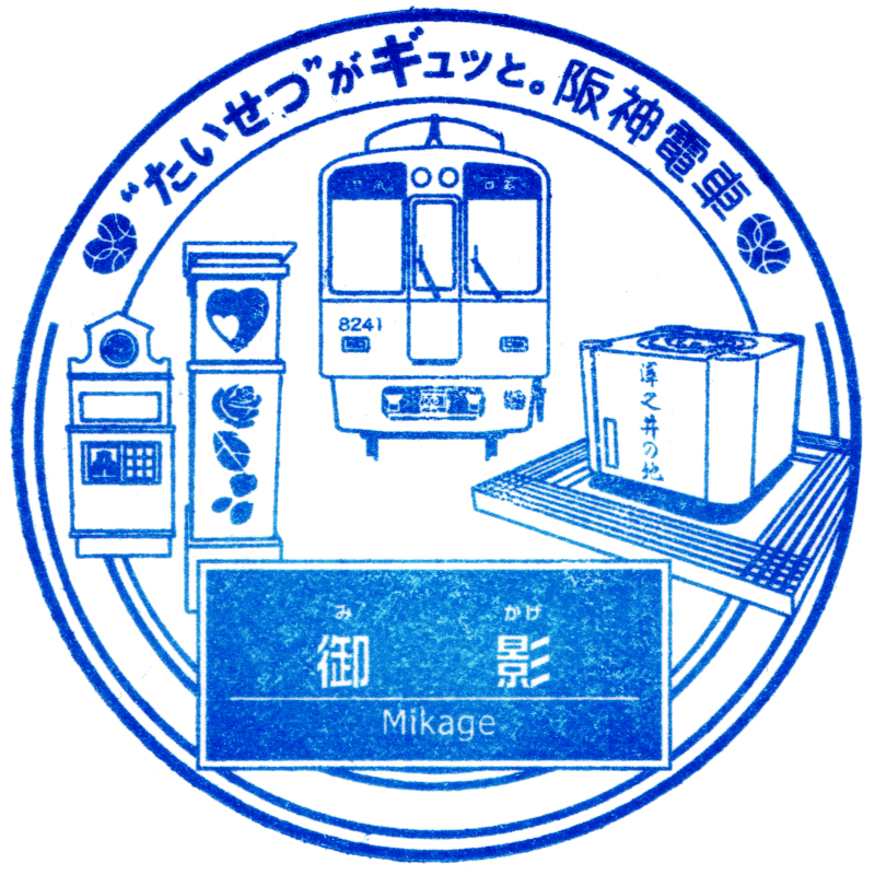 右:御影駅のスタンプも旧スタンプと同一の図案となっています。8000系は阪神を代表する車種となっています。