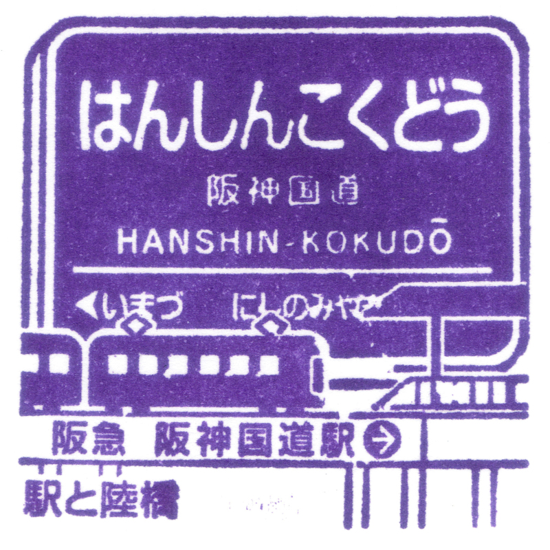 左:阪神国道駅のスタンプには駅名の由来となった阪神国道を跨ぐ高架と駅ホームが描かれています。阪神のようで阪急の駅名となっています。