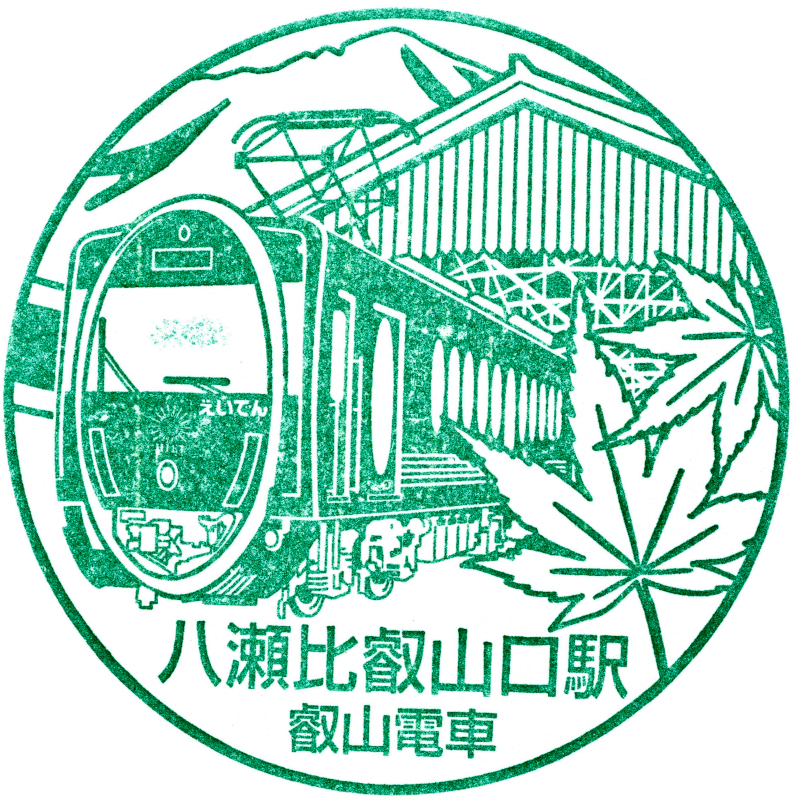 右:八瀬比叡山口駅のスタンプには700系732号車ひえいが描かれています。単行なので叡山本線での運用がメインです。