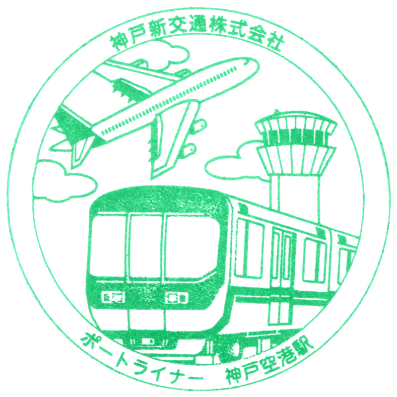 左:ポートライナーの終着駅である神戸空港駅には駅スタンプが設置されています。摩耗が進んで状態は悪いですが、車両と飛行機に管制塔が描かれた空港らしい図案となっています。