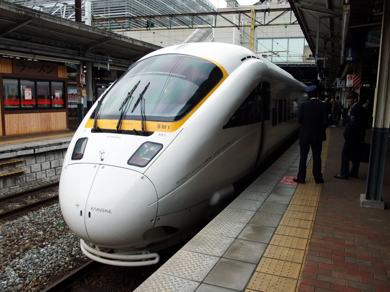 小倉からは青ソニックこと883系に乗車します。水戸岡デザインが炸裂する非常に個性的なデザインに仕上がっています。現在の塗装になってから若干落ち着いた雰囲気になっていますが、それでも斬新さは衰えていません。