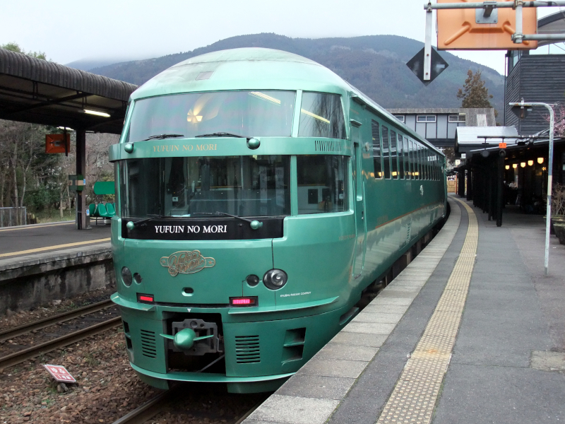 大分駅からはJR九州の観光列車の中では老舗に入る「ゆふいんの森」号に乗車します。緑色の車体に金の縁取りがオシャレですね。