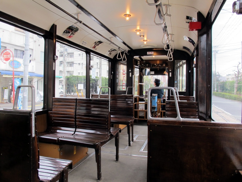 車内は木をふんだんに用いた温かみのある雰囲気に仕上がっており、大きな窓のお陰で開放的かつ明るい車内になっているので、車両の小ささを感じさせません。アルミ材で出来た個性的な吊革が、時折カランカランと音を立てながらゆっくり走ります。