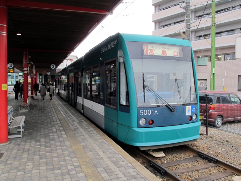 前回の広島訪問時は連休中でバスが遅れたのですが、今回はとても順調でした!それでもバスで45分は遠く感じますね。もう少し便利にならないかな?バスを降りて、早速広電のハノーバー電車に乗車します。