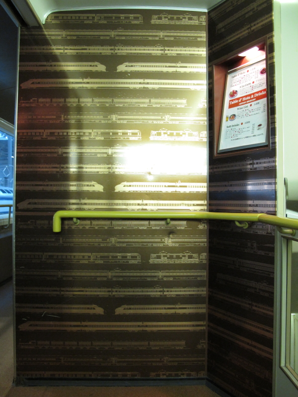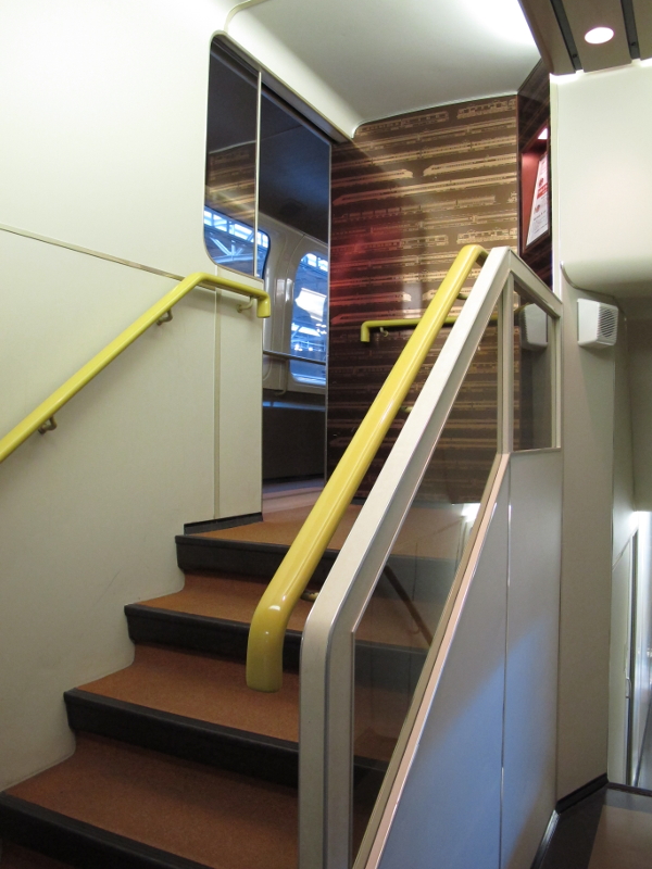 食堂の入口の階段部分です。在来線では考えられないくらい贅沢な空間の使い方でゆとりを感じます。階段を登り切った先の壁には…