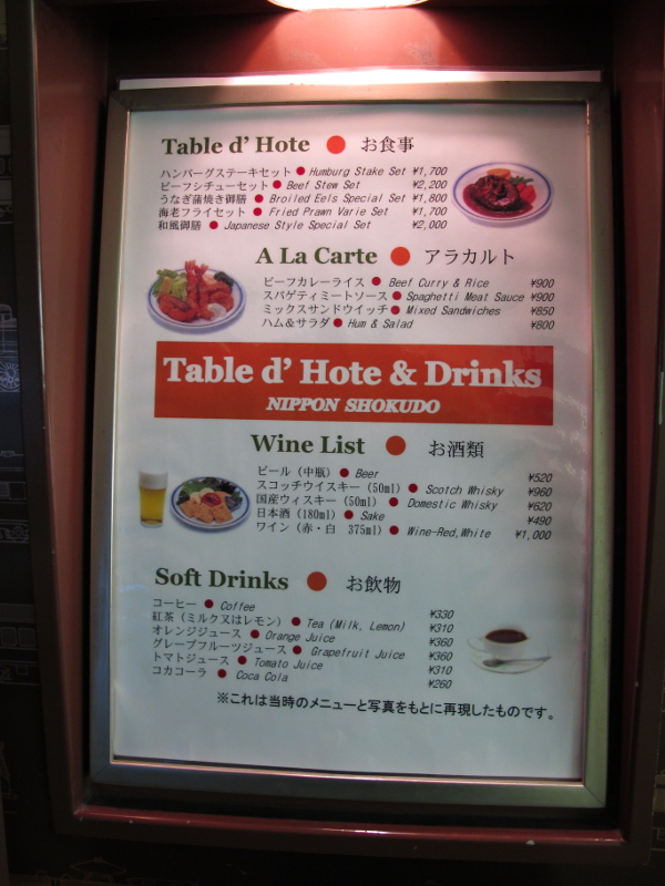 東海道・山陽本線を代表する列車たちが描かれています。その横には当時のメニュー表が設けられています。
