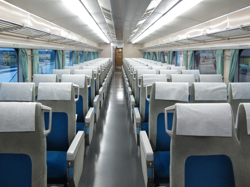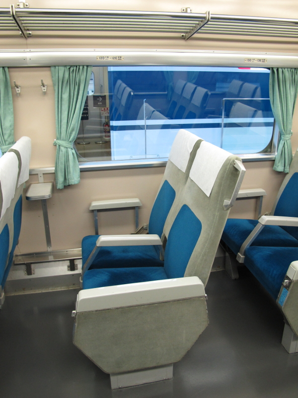 >車内は2+3配列の転換クロスシートです。現代ではクレームが来そうな装備ですが当時はこれでも十分だったのでしょうね。パイプ式の網棚も新幹線車両としては新鮮に映ります。
