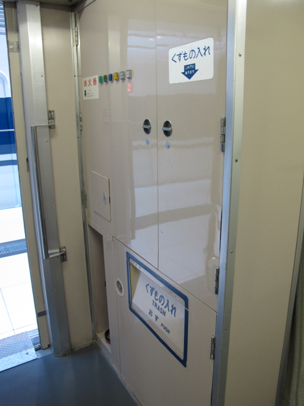 >デッキには冷水器も置かれていました。夜行列車などで設置されていたものより大型で床置き式になっています。晩年には撤去されました。
