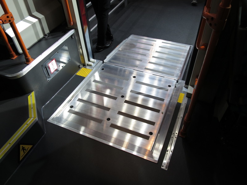 今までのノンステップ車は車イスでも通れるように前扉を特殊な形状にして通路を確保していましたが、実際には中扉のみでの運用が主流となっていることから、思い切って前扉の開口部を縮小してワンステ車に近い形状になりました。