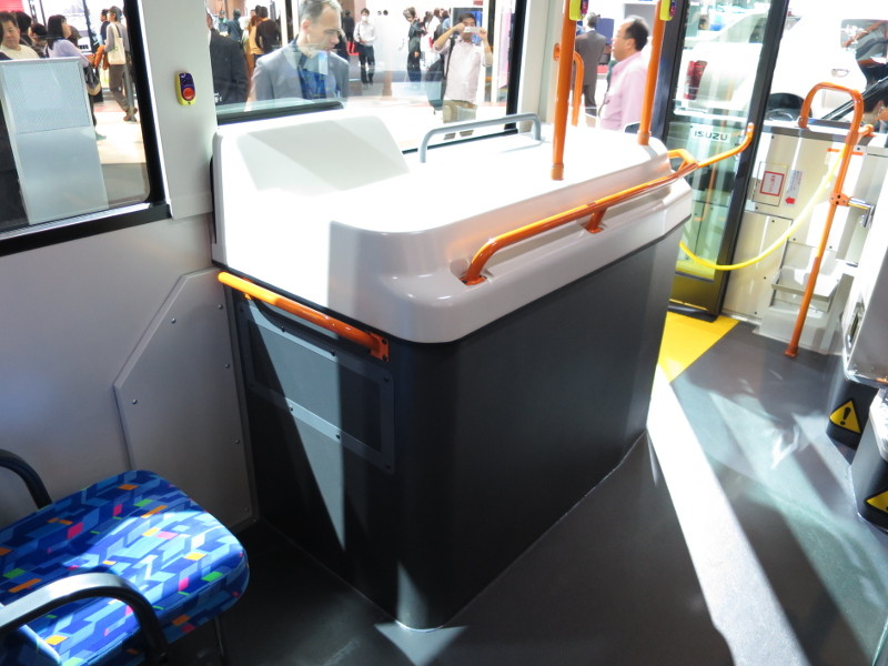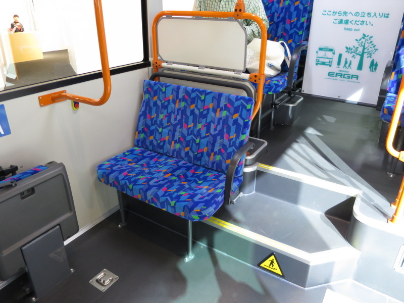 反対側の残された運転席背後の席は座席の後方に移設して足元を拡大しています。ちなみにこのバスに採用されている座席は天龍工業製で、上方に手すりが新設されて立ち上がりの際に掴みやすい形状をしています。座り心地は低反発シートのようで、短時間なら問題ない感じです。