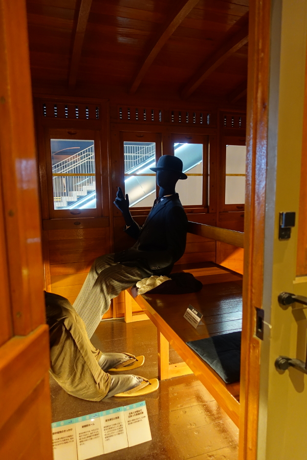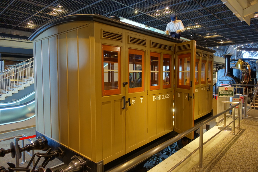 こちらは明治期の客車を再現したものです。遊園地のアトラクションのように各区画ごとに独立したドアになっていて外からカギをかける仕組みになっています。