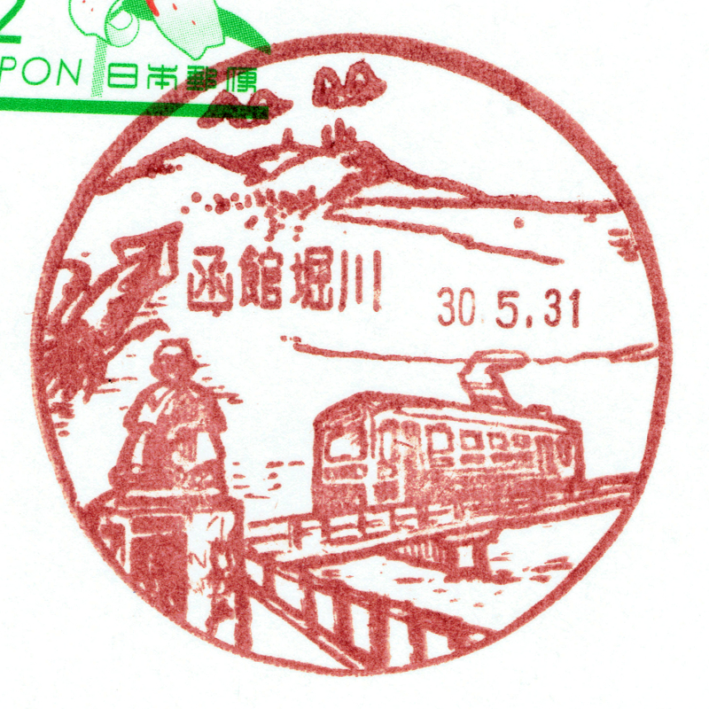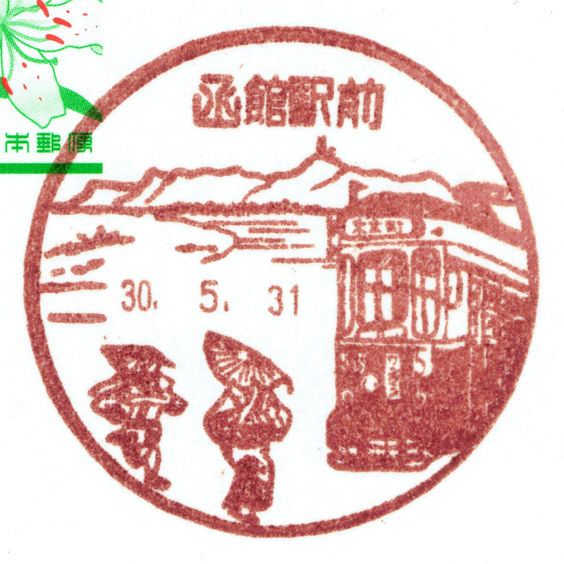 函館駅前局でも函館市電が描かれた風景印を頂きました。こちらは500形電車が描かれています。