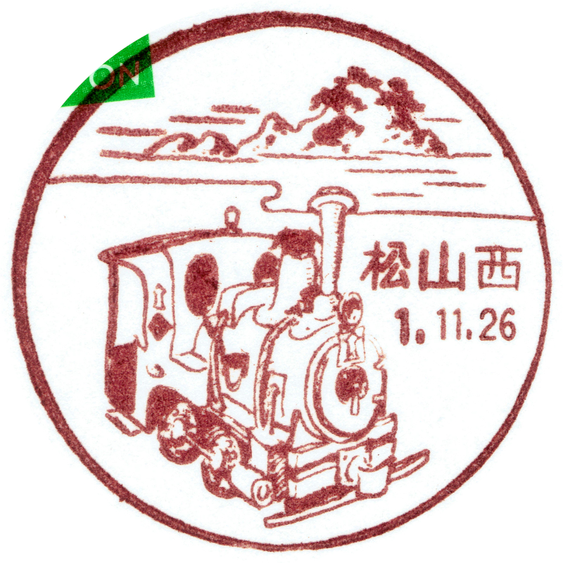 伊予鉄の山西駅から少々複雑な生活道路を歩いて、松山西局で最初の風景印を頂きました。伊予鉄でかつて運行されていた蒸気機関車「坊っちゃん列車」が描かれています。この先訪問する4局でもこの坊っちゃん列車が描かれた風景印が登場します。