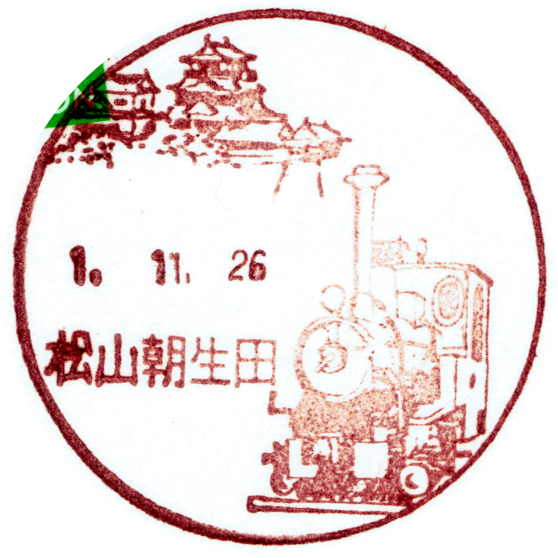 松山市駅からバスに乗車してやって来た松山朝生田局でも風景印をゲットです。伊予鉄の駅からはかなり離れていますが、坊っちゃん列車が描かれています。
