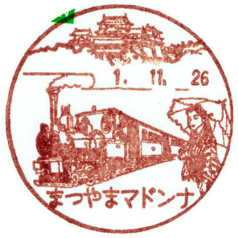 バスで松山市駅に戻ってきてから、10時開局のまつやまマドンナ局で風景印を頂きます。ここは百貨店の中に郵便局があるので開局が遅めです。