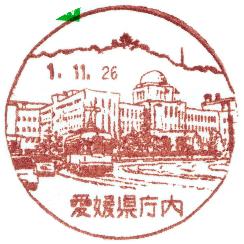 図案は「重文・松山城天守遠望と愛媛県庁に路面電車に自動車を描く」です。風景印を頂いた後で局員さんから古めのはがきを一枚頂きました。そこには使用開始初日の風景印が押印されていました。貴重なハガキを頂けて大満足です!