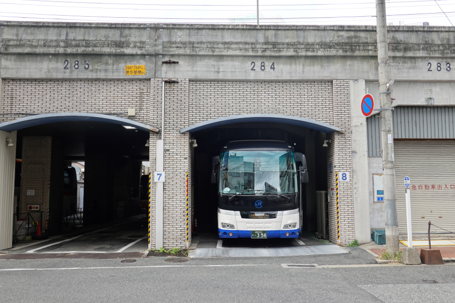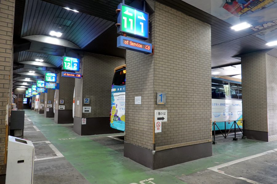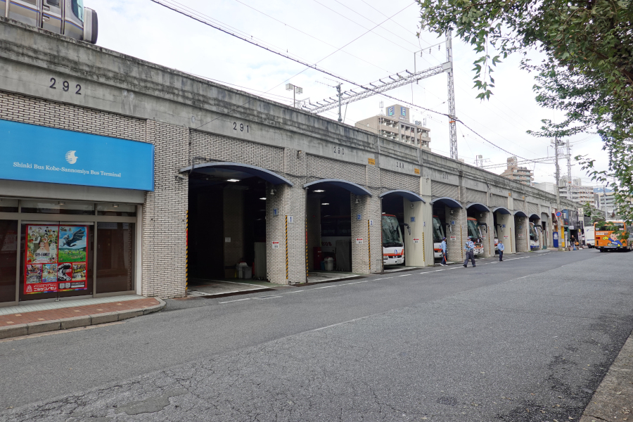 ポートレイク号は神姫バスとの共同運行路線なので、神戸三宮のバス停は神姫神戸三宮バスターミナルとなります。バスマニアには有名な高架下に存在するバス停です。今回は一番端の8番乗り場に到着しました。