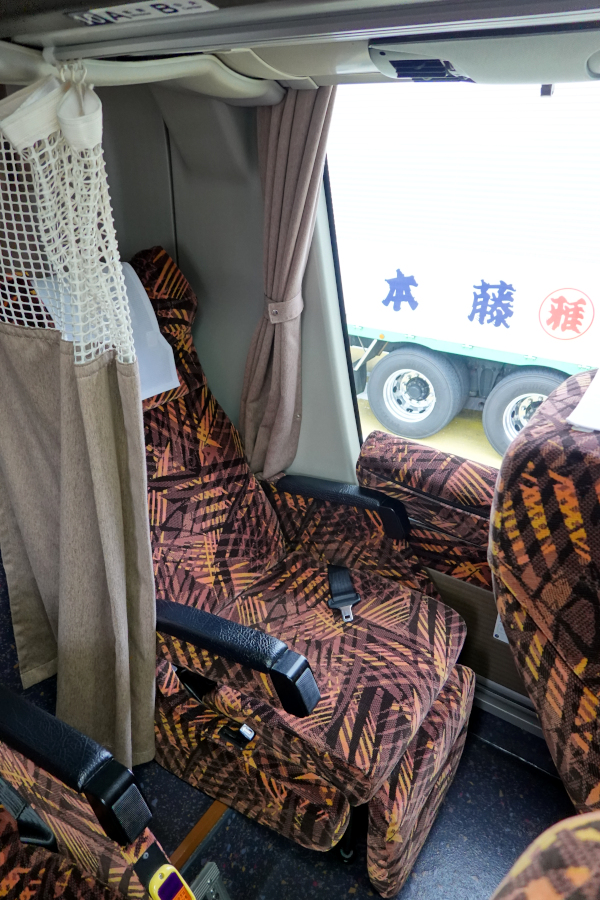車内は3列シートで窓側席には通路や隣席との仕切りカーテンが設けられています。これが本当に便利で、A席を利用したのですがB席としっかり仕切られて長時間の乗車でも快適でした。ただしリクライニング出来るからと最後列を指定したのですが、エンジンの振動や騒音が非常に大きかったのは苦痛でした。1か月前の予約段階で既にほぼ満席の状態で、選べる座席が少なかったので高知エクスプレスの人気の高さが伺えます。