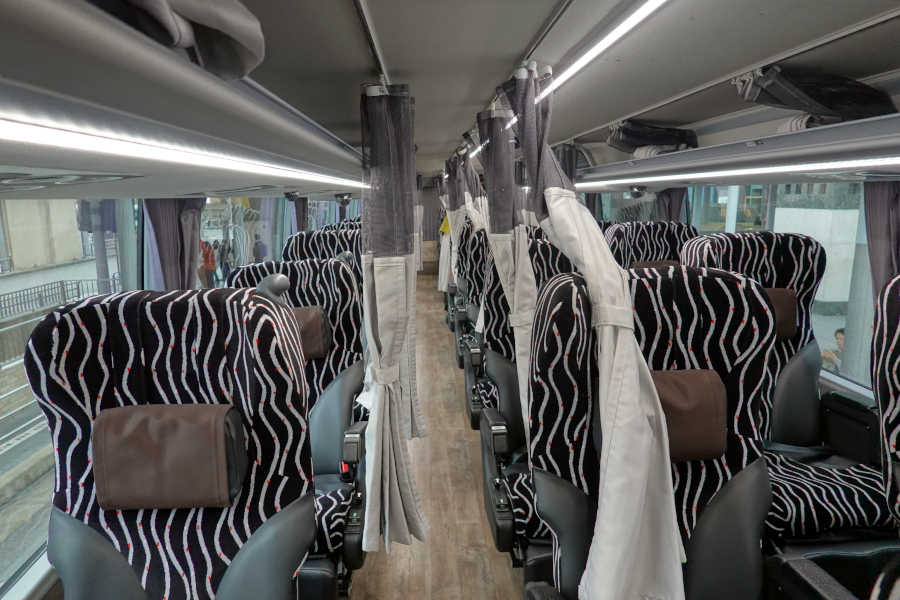 車内は2階席が3列独立シートで、1階席は4列シートとなっています。窓側席には仕切りカーテンが設けられています。1階席は2階席より多少安価で利用できるようです。