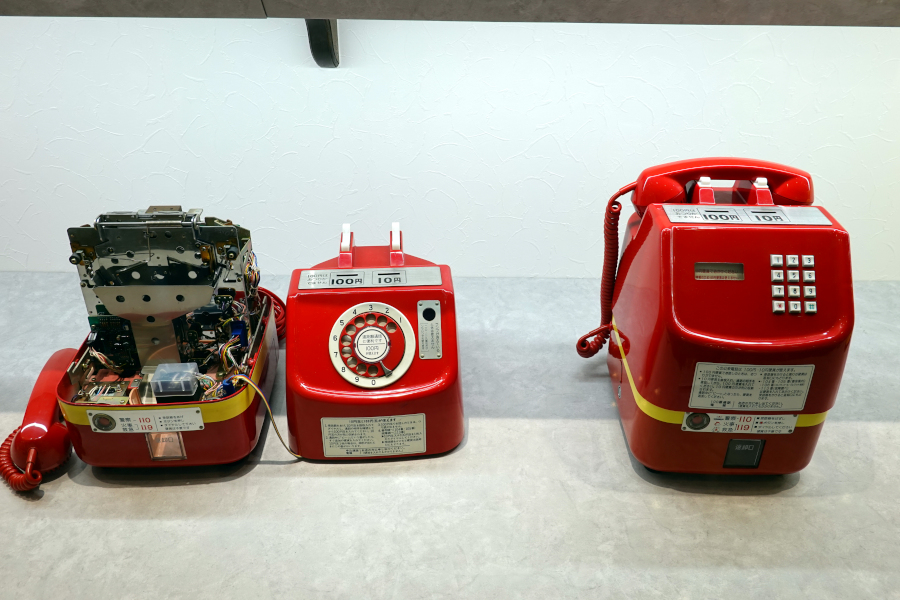 ここから怒涛の公衆電話機ラッシュです。色も形も様々な公衆電話機の魅力をお楽しみください。こちらは見た目からズバリ「赤電話」正式には委託公衆電話です。NTTが直接設置するものとは異なり、商業施設や商店などの構内に設置して、電話機の管理を委託している形態の公衆電話だそうです。こちらはその中でも初期にあたるモデルだそうです。