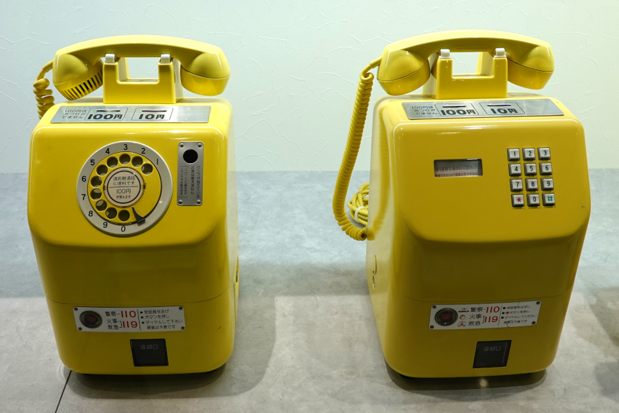 10円玉に加えて100円玉も利用可能な一般的な公衆電話機として登場したのが「黄電話」です。形状はそっくりですが、ダイヤル式とプッシュ式の両方があったようです。