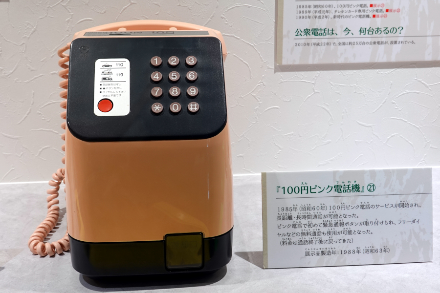 1985年にはピンク電話でも100円硬貨に対応した機種が登場しました。展示されているのは1988年製ですが、今までの機種と比べると現代的で新しく感じます。またピンク電話では初めて緊急通報ボタンが追加されました。