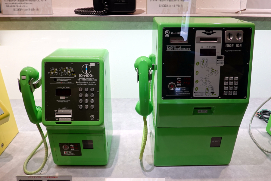 ここにきて平成一桁世代の方なら馴染みのある電話機の登場です。従来の公衆電話機は全て硬貨しか使えませんでしたが、テレホンカード対応電話機として区別するため緑色が採用されたそうです。右側の大型のタイプは電話ボックスで、左側のタイプは商業施設や駅などで見かけました。