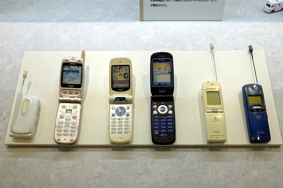 左:1991年にサービス開始した超小型携帯movaの初代機種です。当時の世界最小端末で、契約数も激増したそうです。どちらも実用性重視で飾り気のないシンプルなデザインです。2機種あるうち左側は折り畳みタイプです。かつての携帯電話といえば長く突き出たアンテナも特徴です。