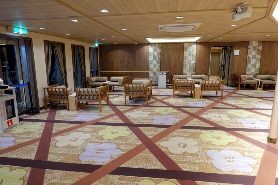早朝に起きて船内散策します。中央には3層を貫く吹き抜けが設置されています。開放感があって快適です。吹き抜け周囲にはフリースペースがあります。