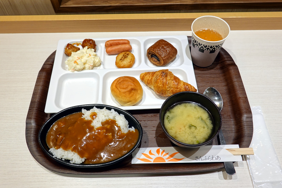 昨晩財布にダメージを負いましたが、懲りずに朝もバイキングです。朝食は750円と良心的な価格なので安心して食べられます。昨晩食べられなかった五目御飯を楽しみにしていたのですが、夕食のみの提供だったようで代わりにお粥が置かれていました。なので昨晩に引き続きカレーを食します。