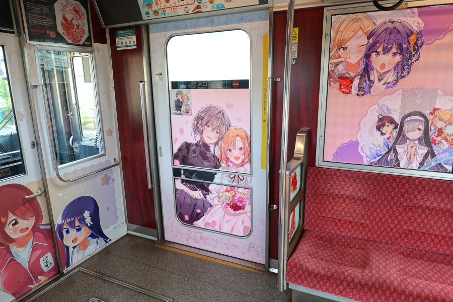 車内にはラッピングが施されています。「ゆるゆり」と「私に天使が舞い降りた!」ですね。わたてんって百合作品の分類なんですね。